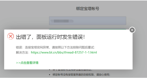 机器故障:客户机器在登录宝塔面板后绑定宝塔手机账号时提示如下报错