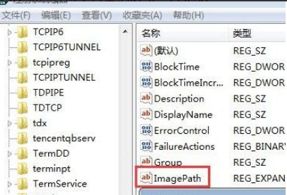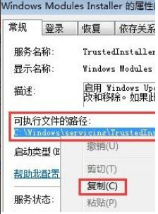 6、在左侧窗口依次展开以下分支:HKEY_ LOCAL_ _MACHINE\SYSTEM\CurrentControlSet\services\TrustedInstaller ,双击右侧窗口的"ImagePath”键值,将刚才复制的可执行文件路径粘贴进去,单击"确定”。