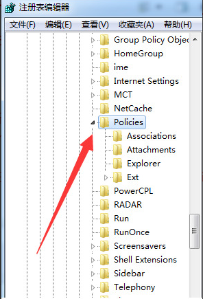 4.进入注册表界面,依次展开到HKEY_CURENT_USER\Software\Microsoft\Windows\CurrentVersion\Policies项下。