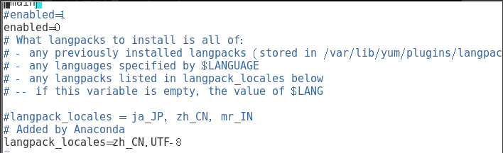 1.编辑文件修改/etc/yum/pluginconf.d/langpacks.conf,将enabled=1改为enabled=0
