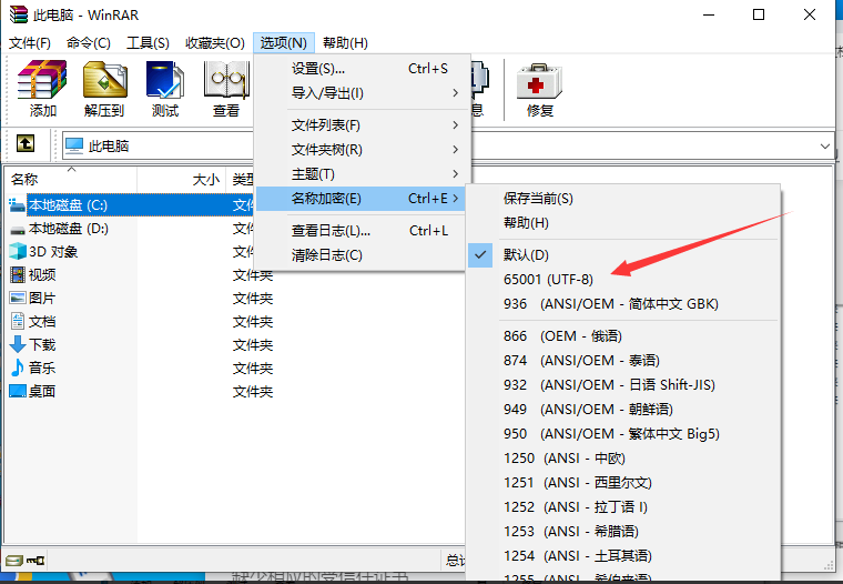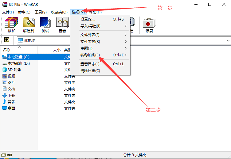 1.打开压缩软件,在选项中找到名称编码,下图为名称加密,这是压缩软件类型不同导致的翻译不同,实际是一样的