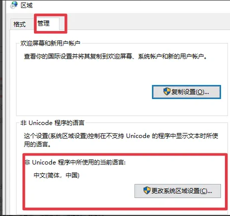 6.在打开的窗口界面中,点击上方中的"管理"选项卡,然后点击下方中的"更改系统区域设置"按钮。