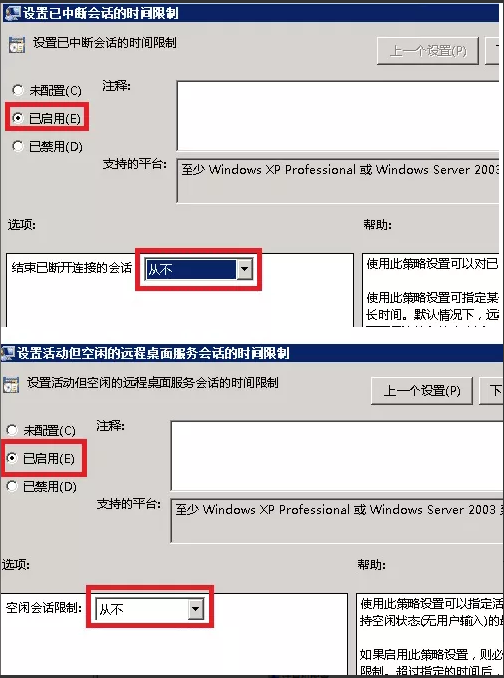 3.再点击设置已中断会话的时间设置,将选项改为从不