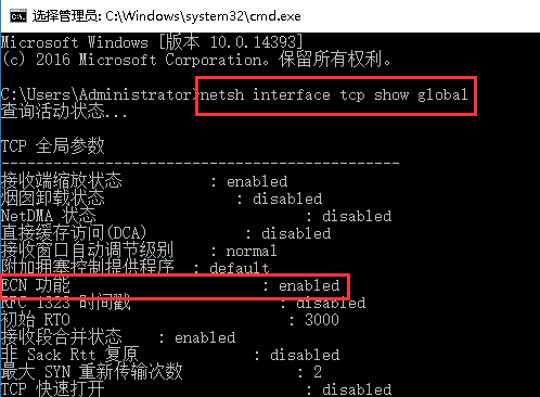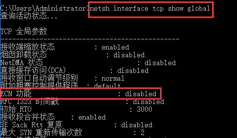 4.此时输入netsh interface tcp show global按回车可以查看ECN功能已处于关闭状态