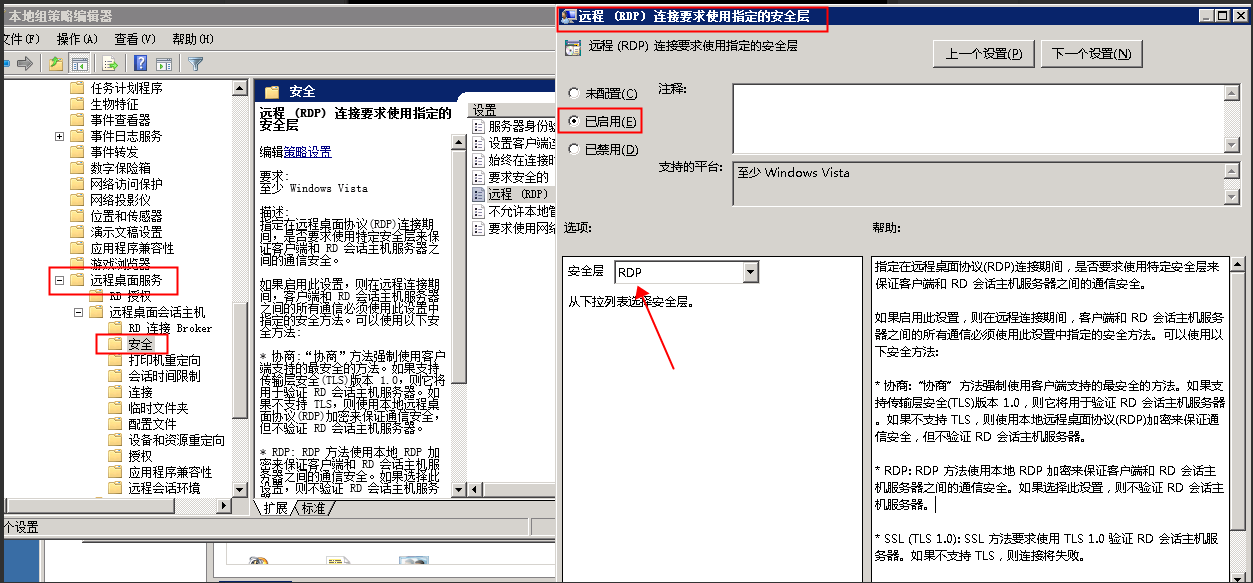 2、运行 -> 输入 'gpedit.msc' -> 选择“计算机配置 -> 管理模板 -> Windows组件”,查找并双击“远程桌面服务” -> 选择”已启用“并将安全层改为”RDP“