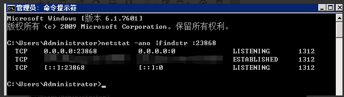 1、 运行 -> 输入 'cmd' -> 输入命令查看 ‘netstat -ano |findstr :23868’ 远程端口是否被占用(注意!这边 23868 为测试机远程端口) ,如果被占用则可以修改与远程端口冲突对应服务的端口或者修改远程端口即可。 如无冲突,继续执行下面的操作。