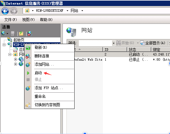 1、右键点击iis全局设置,如果是停止状态那么点击启动即可,如果是启动状态,可以考虑点击重启。