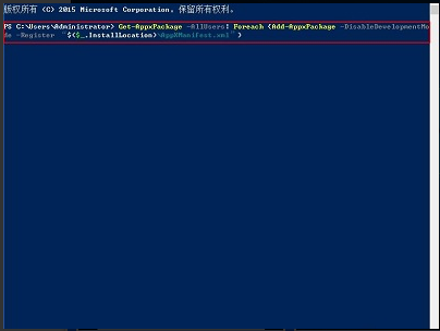 在新出现的窗口中,直接输入如下的命令,Get-AppxPackage -AllUsers| Foreach {Add-AppxPackage -DisableDevelopmentMode -Register “$($_.InstallLocation)\AppXManifest.xml”}
