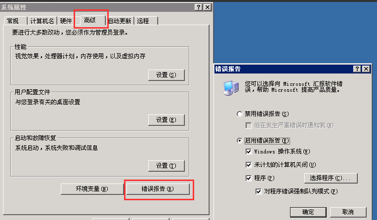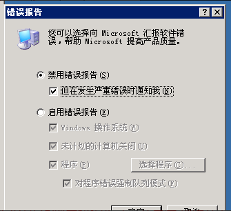 2.在弹出的窗口中选择禁用错误报告,并且复选“但在发生严重错误时通知我”