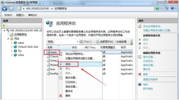 2、接着我们需要找到对应网站的应用,如图我这里是“aaaa”网站,右键点击“启动”