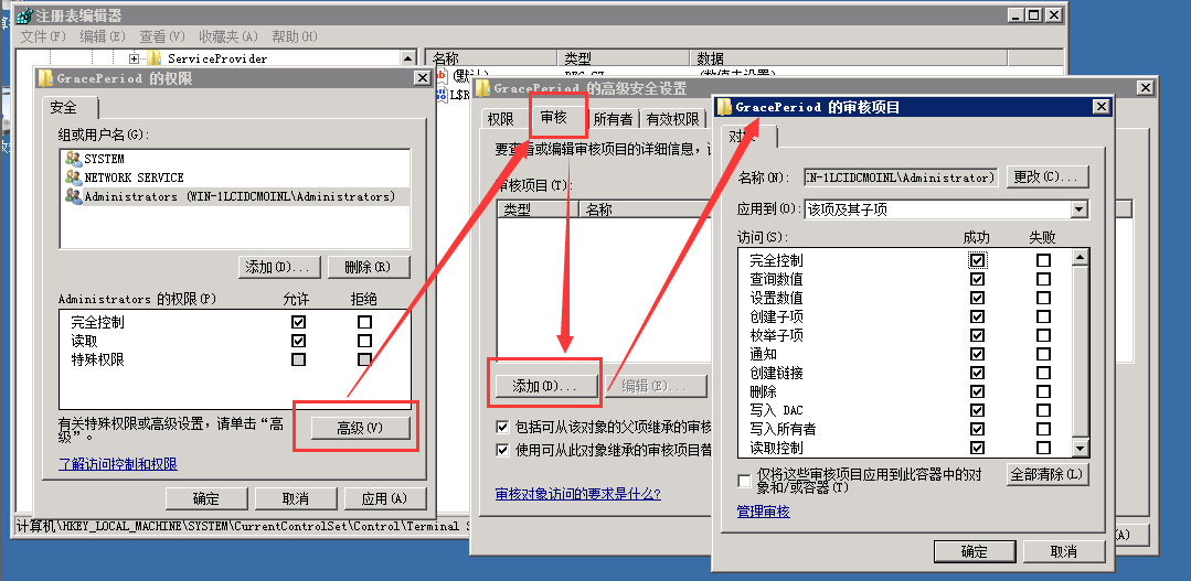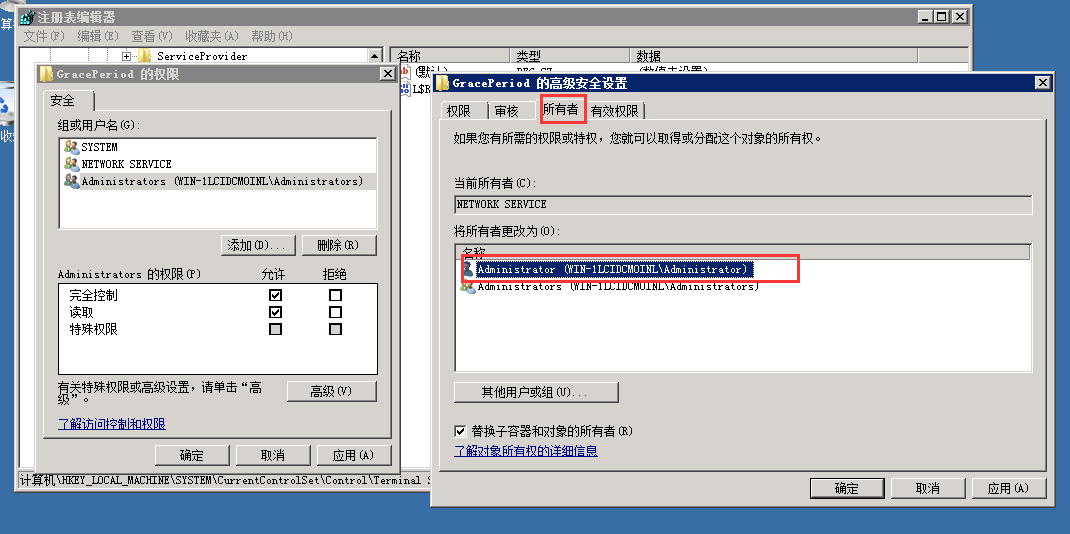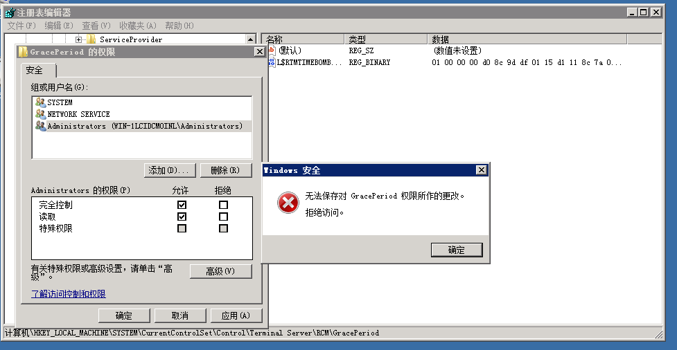 3.修改“GracePeriod”的管理员权限,勾选完全控制为允许,勾选读取为允许。
