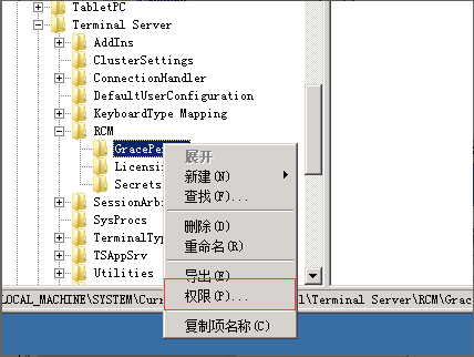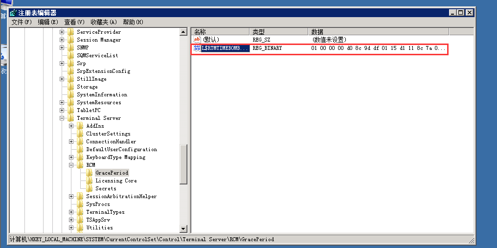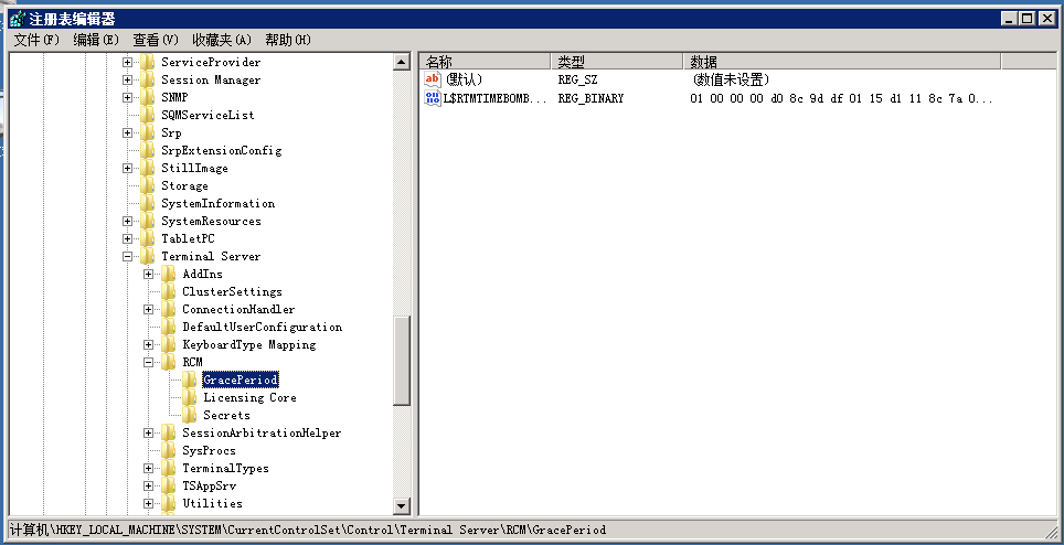 2.在注册表对话框中依次打开“HKEY_LOCAL_MACHINE\SYSTEM\CurrentControlSet\Control\Terminal Server\RCM\GracePeriod”。