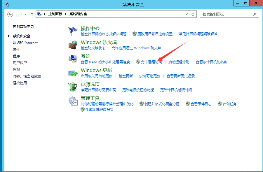 1、 打开控制面板,进入系统安全,然后点击进入允许远程访问设置;