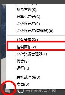 1、在开始按钮点击右键,选择控制面板。