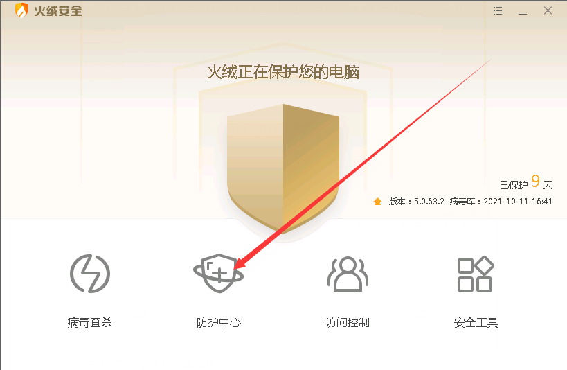 1、打开火绒安全软件,进入防护中心;