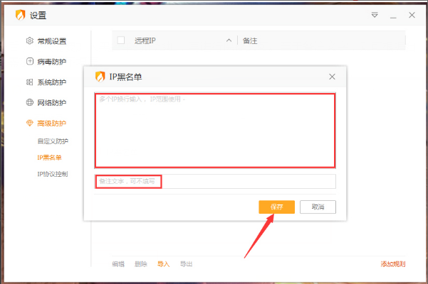 6、最后,输入需要加入黑名单的IP地址,再进行保存即可。至于备注文字,则可根据自身需求填写或不填写。