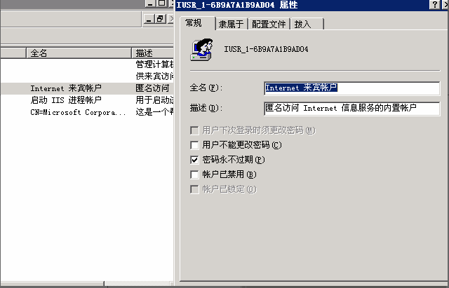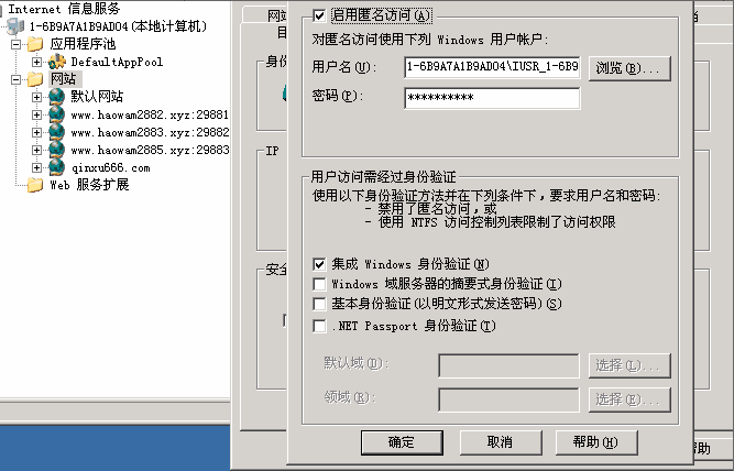 2、IIS上设置:网站属性-目录安全性-身份验证和访问控制(编辑)-启用匿名访问(浏览)-高级-立即查找-选择 Internet 来宾帐户(确认)-输入刚设置的密码(确认后再输入一次)。