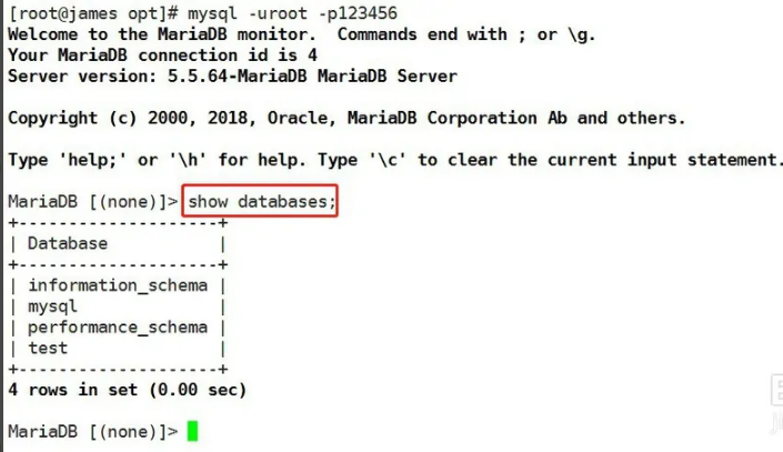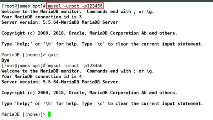 7、执行命令“mysql -uroot -p123456”登陆数据库;