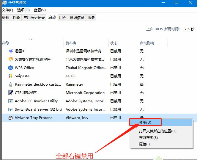 4.随后右键选择“禁止”所有启动项,再关闭页面。