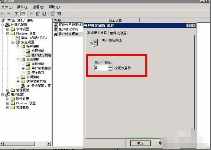 4.在右边找到帐号锁定阀值, 双击这个选项,弹出属性对话框,如图修改为 0