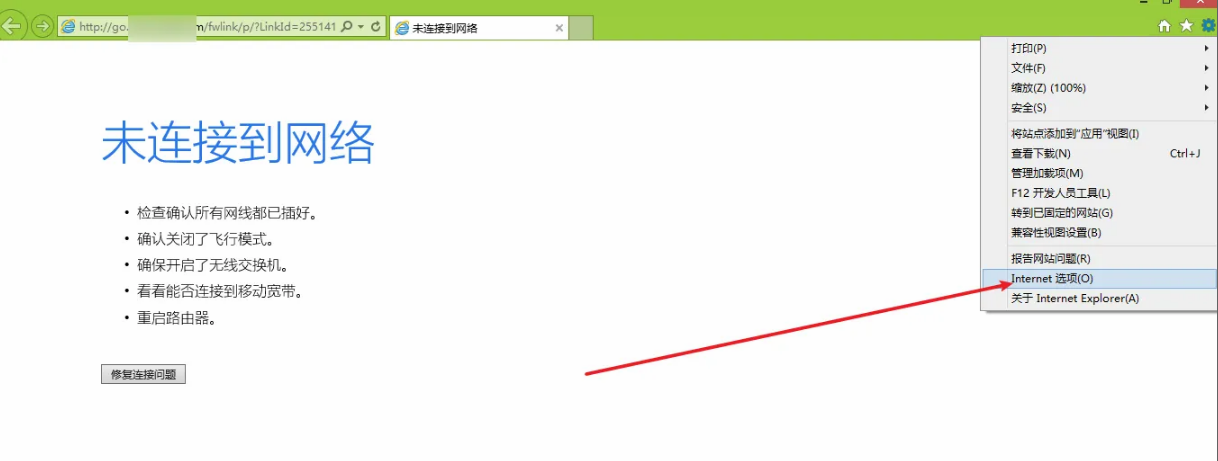 2、在弹出的菜单找到“Internet选项”,点击进入Internet选项面板。