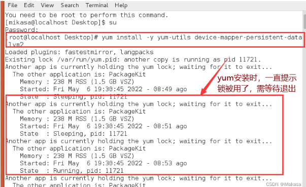 1、另一个应用程序目前持有yum锁,需要等待它退出。