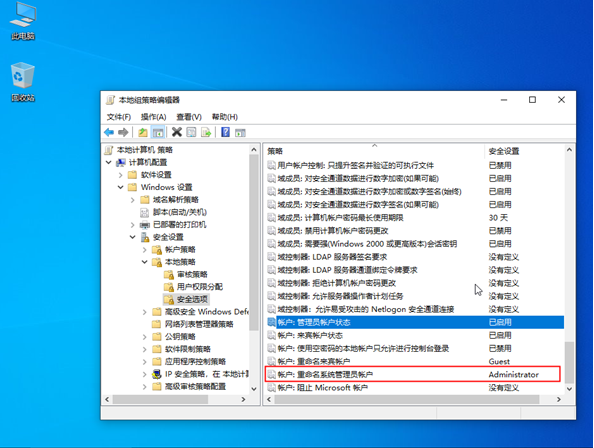5. 选择【安全选项】,右侧找到【账户:管理员账户状态】