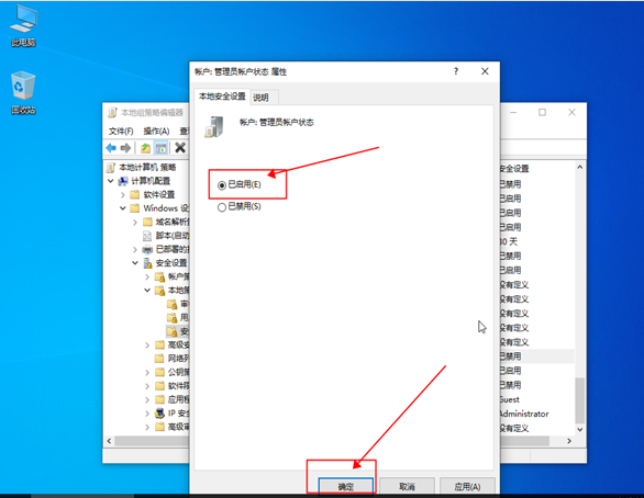 6. 双击【账户:管理员账户状态】打开属性,勾选【已启用】点击【确定】