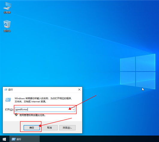 2. 在【运行】窗口输入【gpedit.msc】点击【确定】