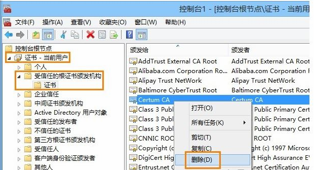 6.打开控制台1中的证书,选择受信任的根证书颁发机构,在点击打开证书,删除右侧的过期证书。