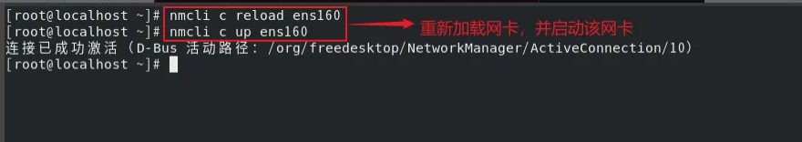 4、地址配置成功以后,需要重启网卡服务。CentOS8中使用nmcli的命令来完成。