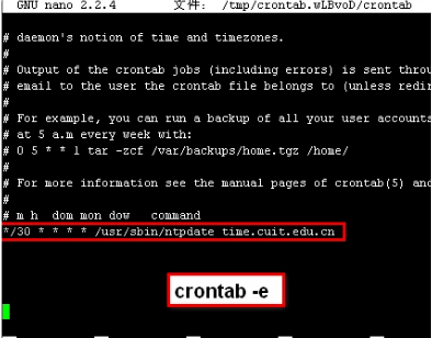 5.由于Debian系统长时间运行,经常性导致系统时间变慢,因此可以使用命名“crontab -e ”,并在文件中添加如下一行“*/30 * * * * /usr/sbin/ntpdate time.cuit.edu.cn ”,表示没30分钟,系统自动同步一次时间。