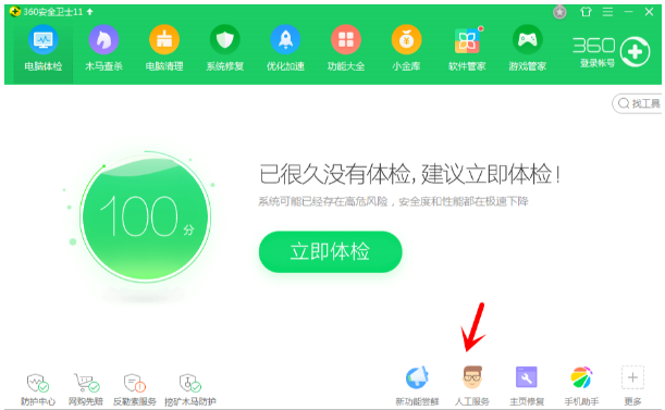 1、打开360安全卫士,进入界面,点击右下角的【人工服务】功能