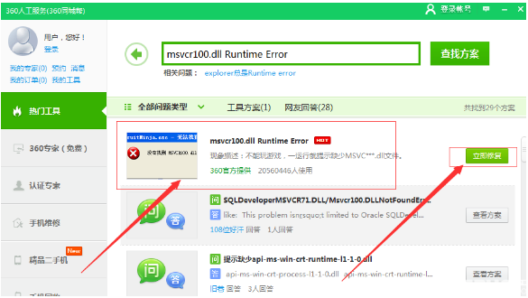 3、如图,找到msvcr100.dll Runtime Error的修复方案,然后点击【立即修复】