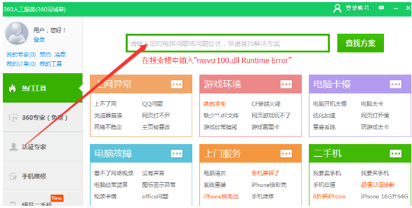 2、进入360人工服务界面,在框框中输入【msvcr100.dllRuntime Error】,点击【查找方案】
