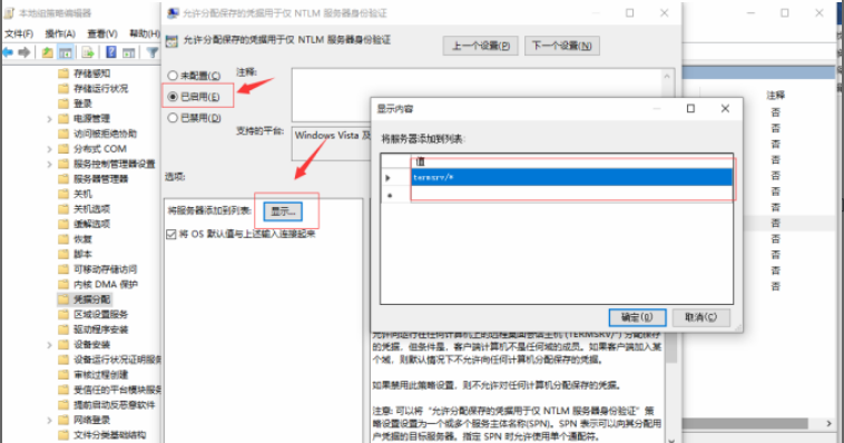 5、会打开该项的编辑窗口,在窗口中选中“已启用”一项,点击选项窗口中的“显示”按钮,在弹出的显示内容窗口中输入termsrv/*,最后点击确定按钮