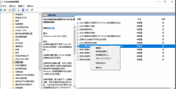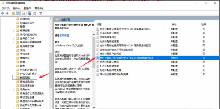 3、在“系统“的菜单下找到“凭据分配”菜单项,点击后在右侧窗口中找到“允许分配保存的凭据用于仅NTLM服务器身份验证”一项