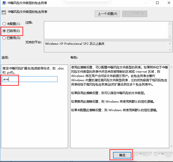 3、点选“已启用”,在选项处输入.exe,然后点击“确定”即可