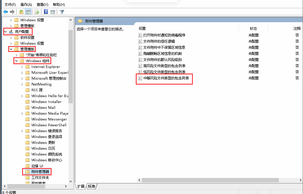 2、按用户配置→管理模板→Windows组件→附件管理器,进入如图所示界面,找到并双击“中等风险文件类型的包含列表”